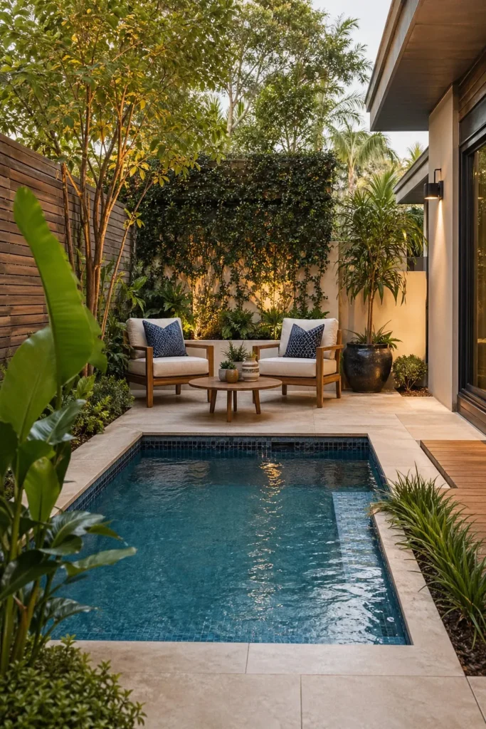 In a tight yard, a plunge pool leaves room for a real patio instead of taking over everything. I have seen the best small layouts place a loveseat or pair of chairs against the house, with planters softening the edges. Use one paving material throughout to avoid visual clutter.