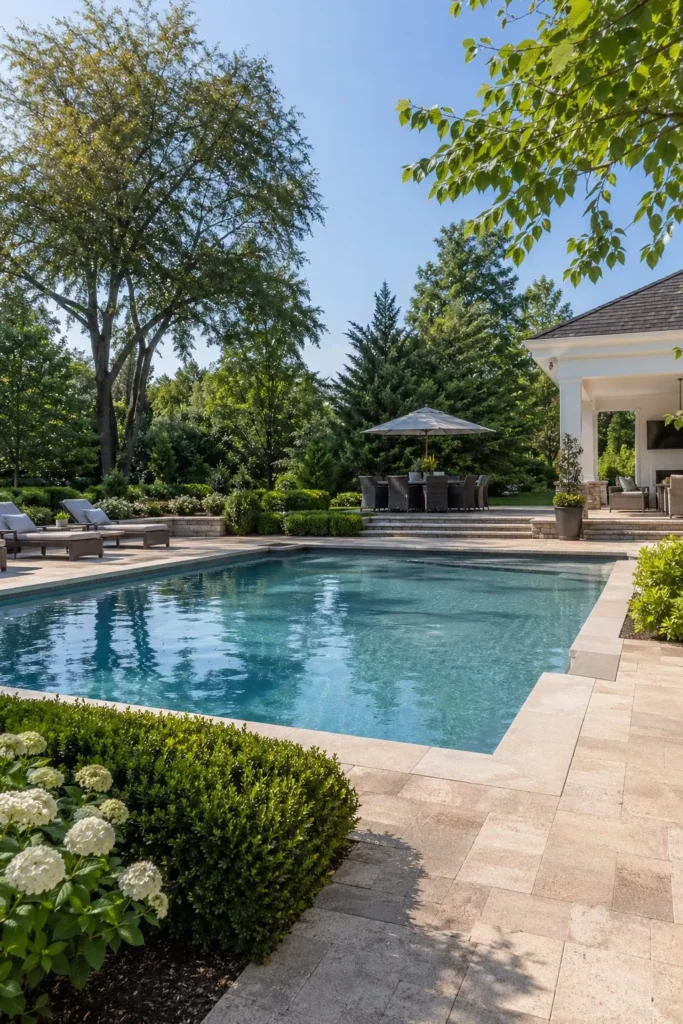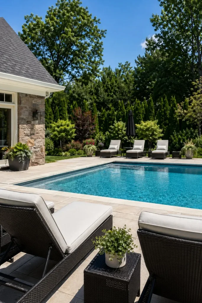 Use the same pavers or stone from your back door to the pool coping for a smooth patio to pool transition. This layout works best when the dining set sits closest to the house, with lounge chairs midway, and the water just beyond. In real backyards, this simple material match makes the whole space feel larger and cleaner.