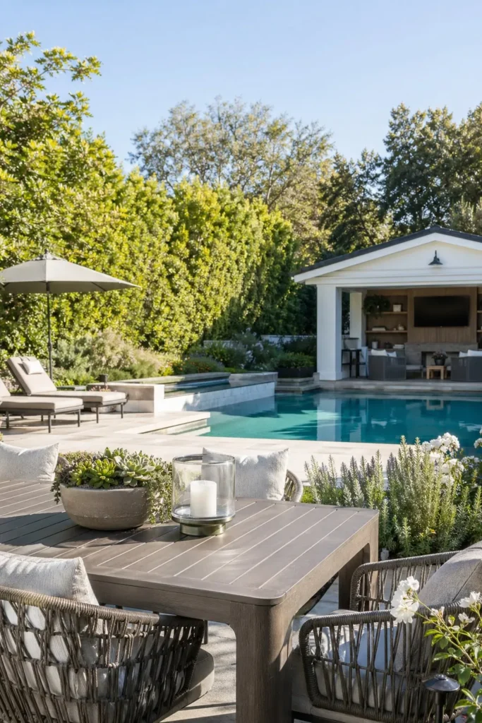 Set your dining area close to the house for easier serving and cleanup, then place the pool just beyond it. This creates a natural daily-use layout where meals, snacks, and swim breaks all happen in one connected line. Add an umbrella or pergola to define the dining zone without blocking the view.