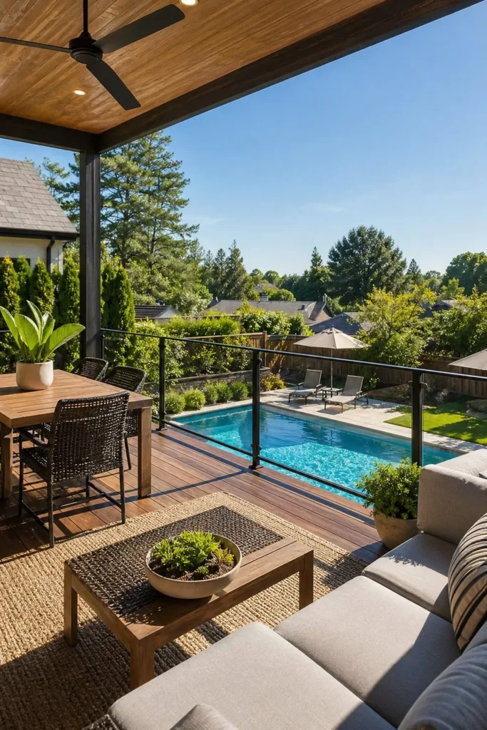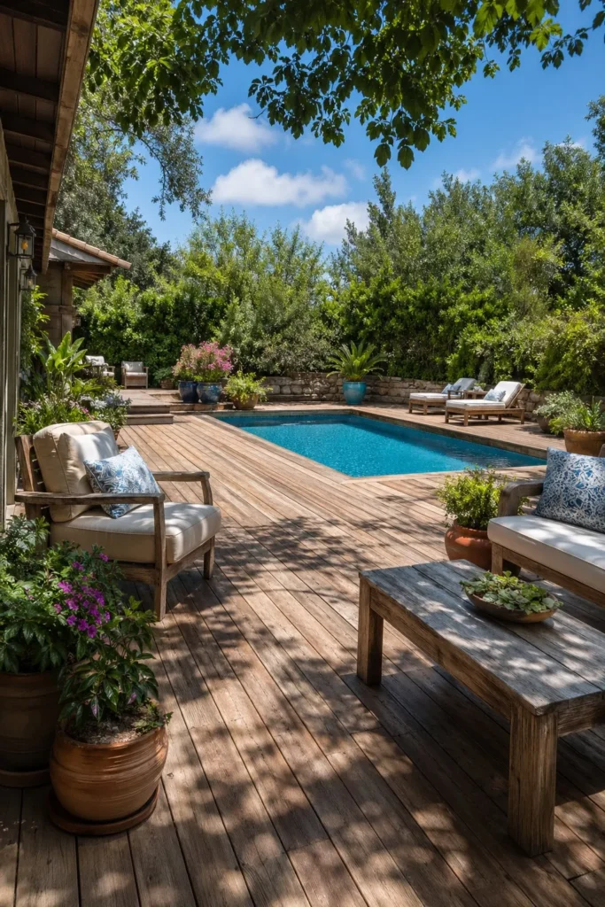 A wood deck softens the look of the water and feels warm underfoot. This layout is especially nice when the deck wraps the pool and leaves space for a small seating nook or dining table. Choose slip-resistant boards or composite decking made for pool areas.