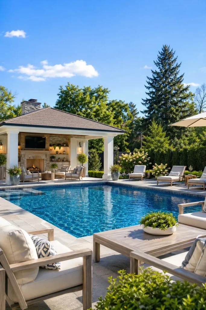 A pool cabana can hold towels, shade seating, and even a changing area, which keeps your main patio less cluttered. Place it at the far end or side of the pool so it frames the view back to the house. It is a strong finishing touch for a backyard oasis with pool that feels complete.