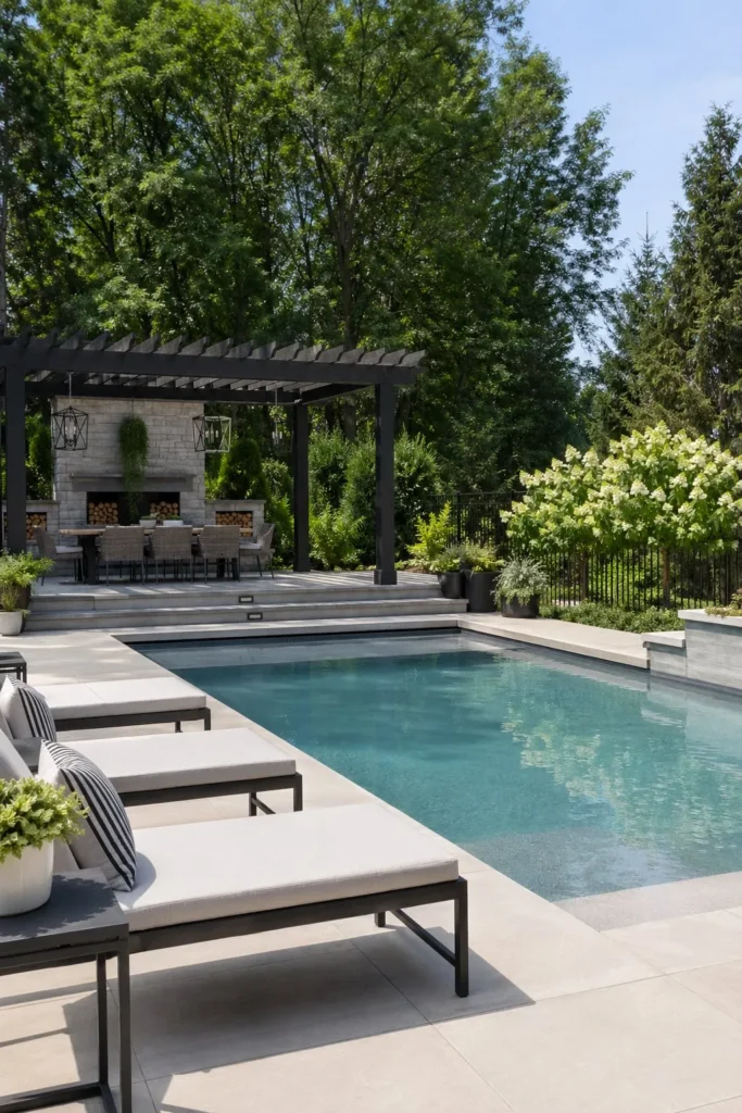Line up lounge chairs on one long side of the pool for a clean resort look. Leave enough deck space for side tables and walking room, then frame the area with palms, ornamental grasses, or clipped shrubs. These backyard pool and patio ideas work best when lounging gets its own clear zone.