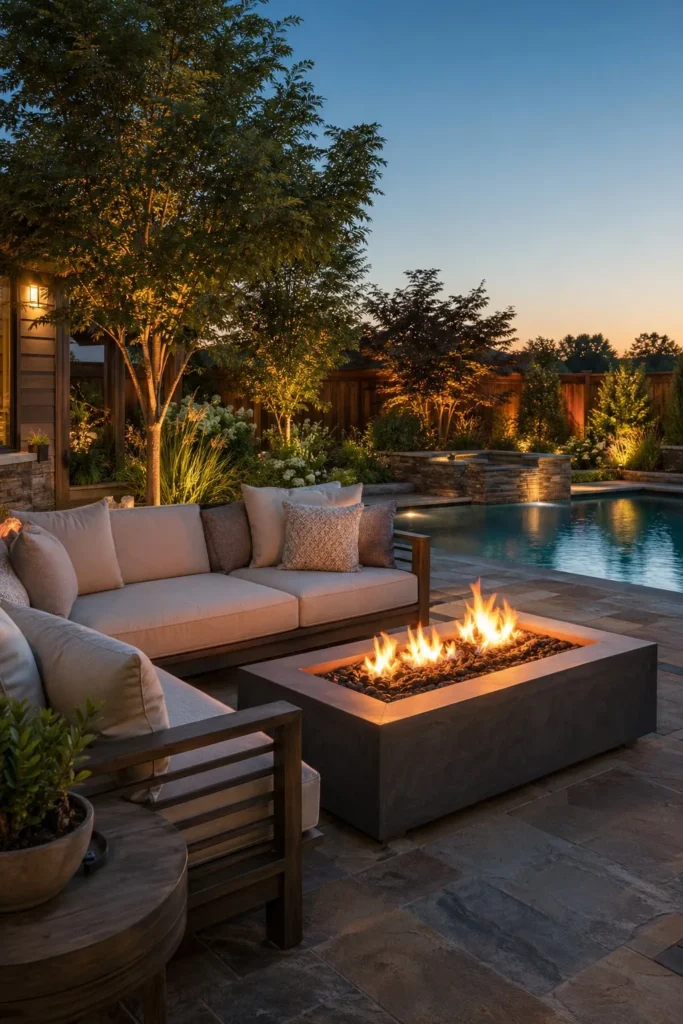 Put the fire pit off to one side of the pool instead of directly in the main walkway. That keeps the swimming path open while creating a second seating zone for evenings. Stone or concrete pavers tie the fire feature back to the patio and help the whole backyard oasis with pool feel balanced.