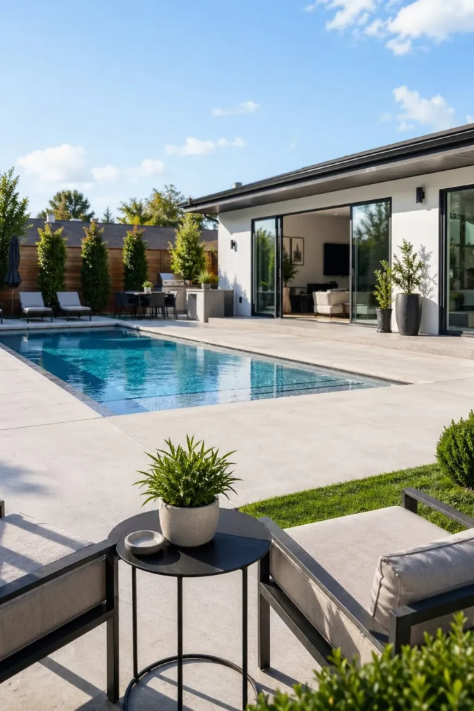 A rectangular pool with broom-finished concrete gives you a crisp, low-fuss layout. Keep the edges simple, with straight planting beds, narrow strips of lawn, and built-in loungers if space allows. This is one of those outdoor patio ideas with pool that stays easy to clean and easy to furnish.