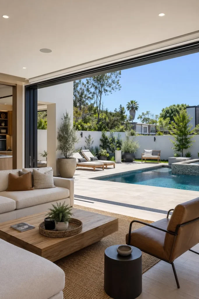 Large sliding or folding glass doors make your patio feel like an extension of the house. Match indoor flooring tones with your exterior pavers so the shift feels soft and natural. This layout is especially strong when the patio seating lines up directly with the pool view.