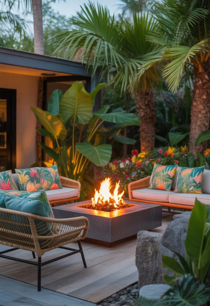 You can create a cozy spot by adding a fire pit in your tropical backyard. Surround it with comfortable seats that have colorful cushions and tropical patterns.