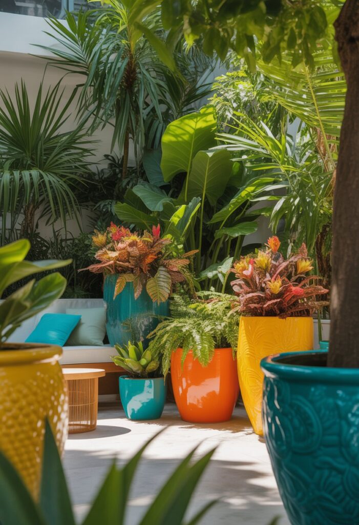 Placing these planters in sunny spots helps your plants grow well and makes your tropical oasis feel lively and inviting.
