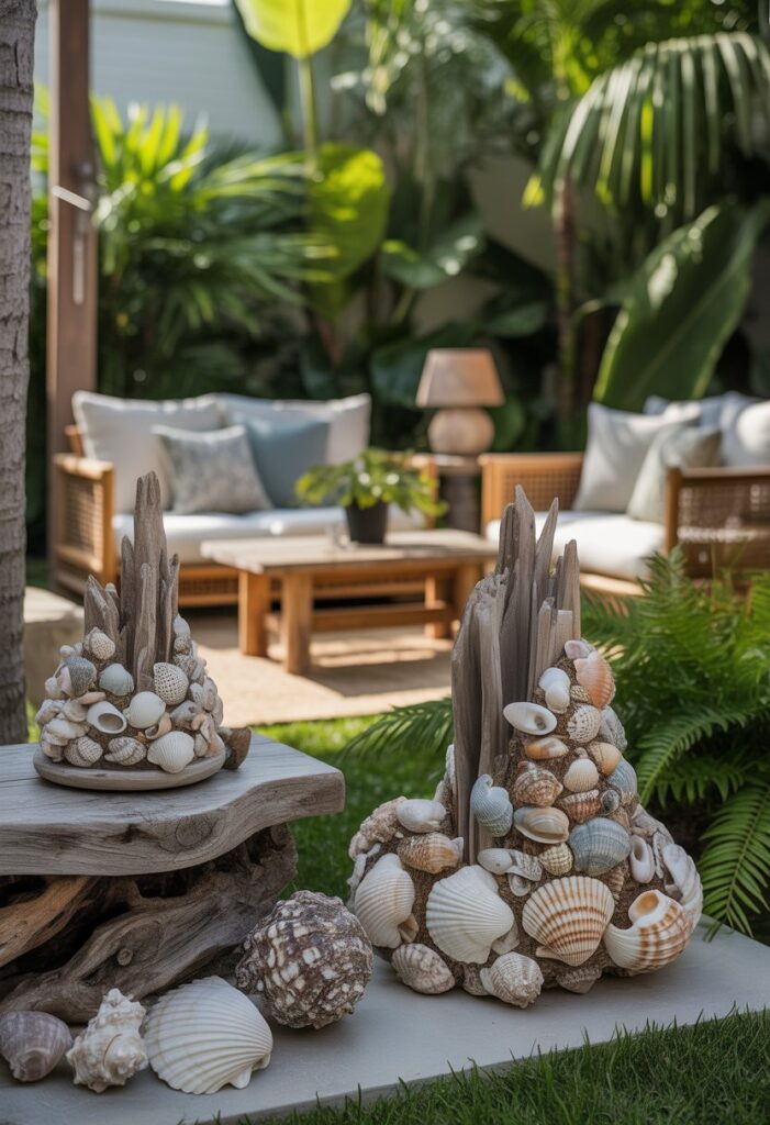You can easily add a beach feel to your backyard with seashells and driftwood. These natural pieces bring calm, coastal charm to your space.