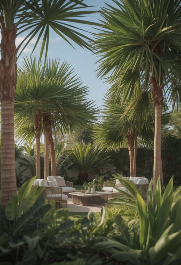 You can use palm trees to create a cozy, inviting spot in your backyard. Place them around your seating area to add natural shade and make the space feel more private.