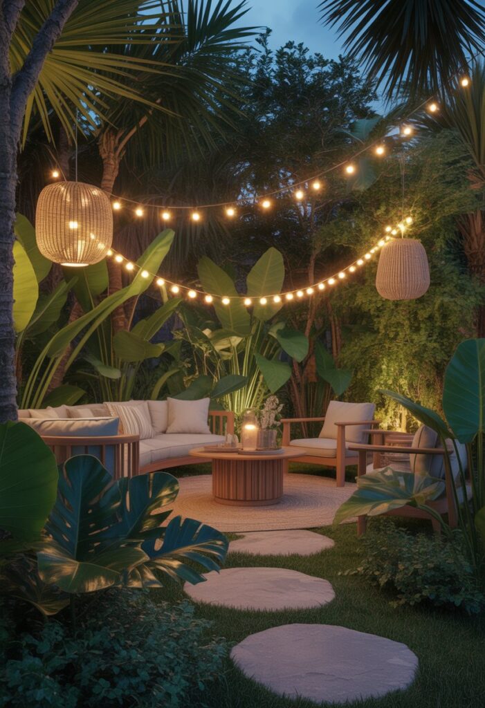 String lights work well over patios, pergolas, or between trees. Lanterns bring a charming touch when hung in groups or used as table decor. Together, they turn your outdoor space into a relaxing tropical retreat after dark.