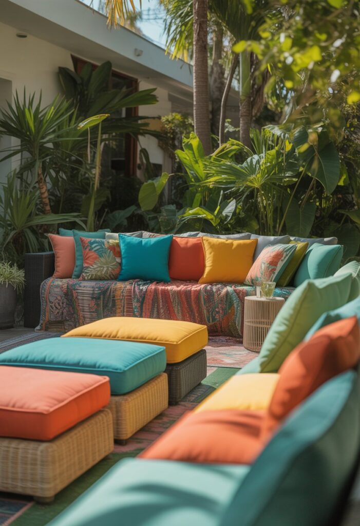 You can easily add a tropical vibe to your backyard using pillows and cushions with tropical prints. Look for bright palm leaves or floral patterns to brighten your seating areas.