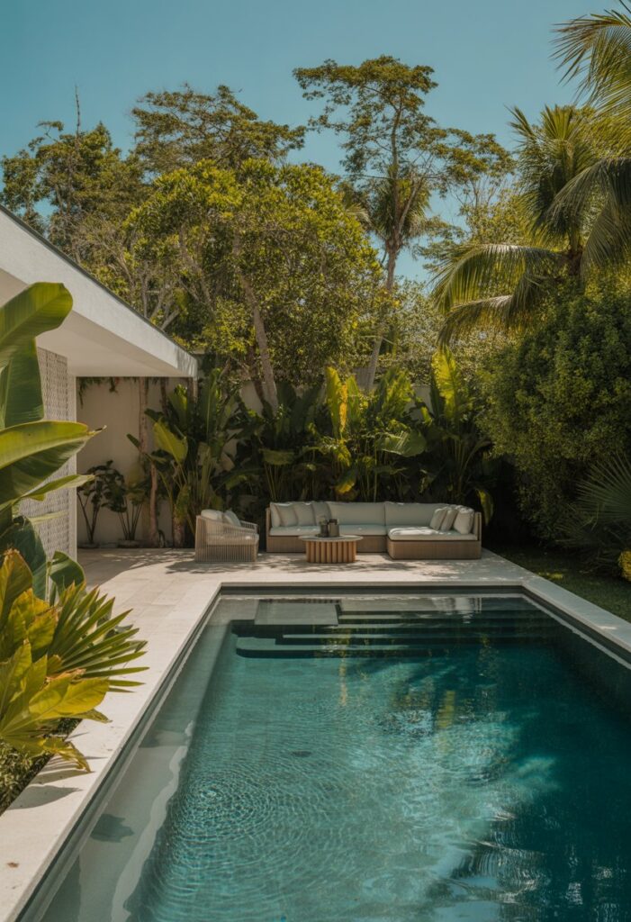 This style fits well with minimalist gardens and lets you add fun furniture around the pool. It’s a great way to make your outdoor space feel both modern and relaxing.