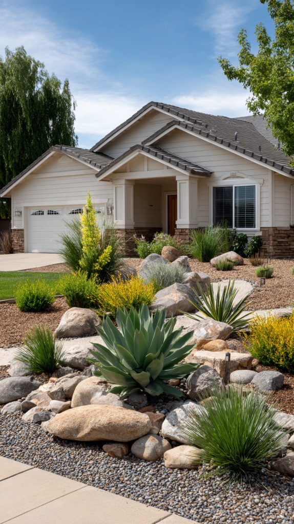 You can make a nice rock garden using big rocks and small pebbles as a base. Plant drought-tolerant plants like succulents, lavender, or ornamental grasses between the stones.