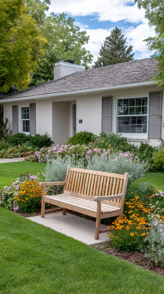 Adding a wooden bench in your front yard creates a pretty spot to rest or chat. It gives your space a warm, natural look that fits many styles.