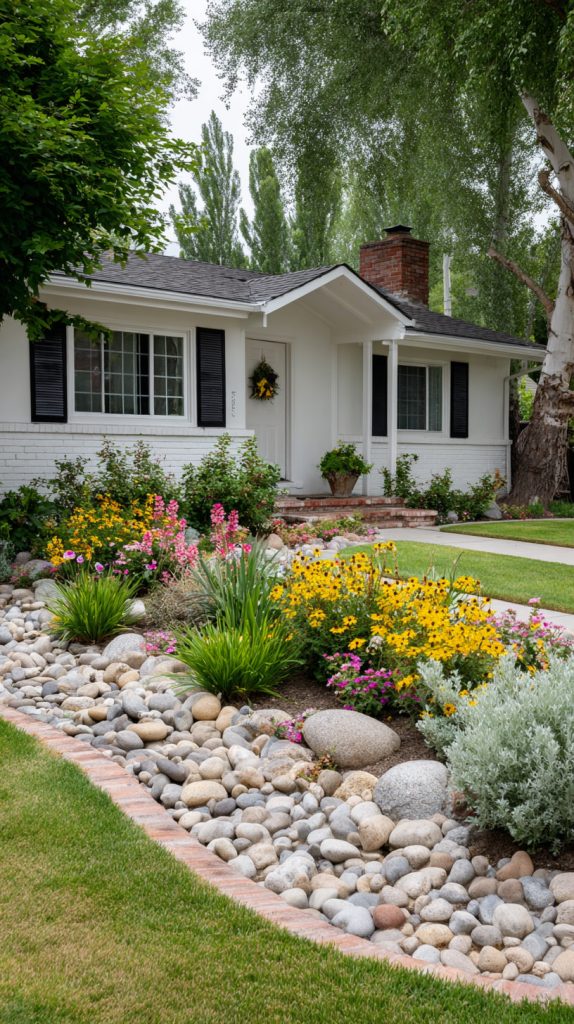 Using colorful gravel in your front yard adds a bright and clean look without much work. It comes in many shades, so you can pick the one that fits your style.