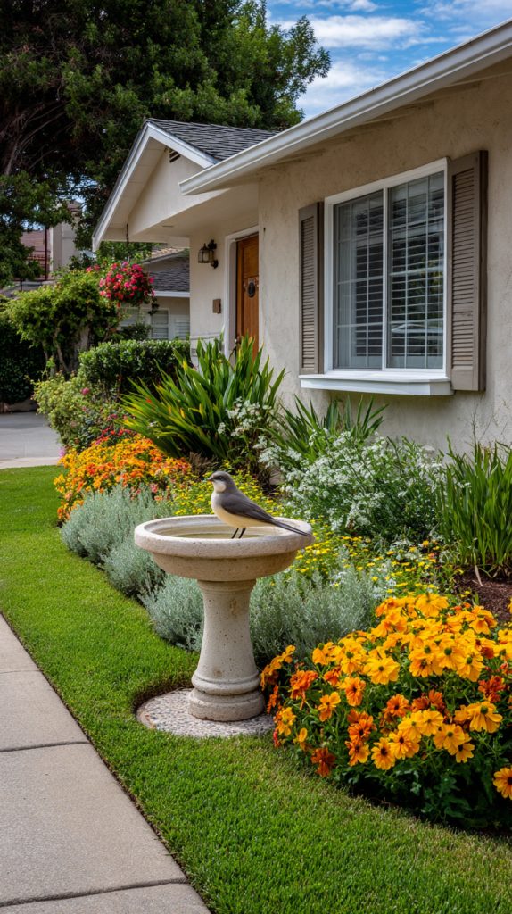 You can easily add a small birdbath to your front yard to welcome birds. A shallow basin with clean water offers a place for birds to drink and cool off.