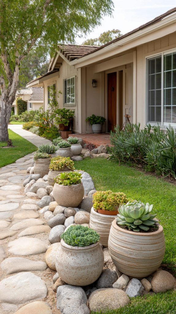 Potted succulents are easy to move, so you can change your look whenever you want. They also keep your plants healthy by controlling soil and water better. Try placing them near your entrance or along walkways for a fresh touch.