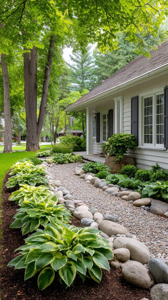 Hostas are perfect for shady spots in your front yard. Their large leaves come in many shades of green and patterns that brighten up dark corners.
