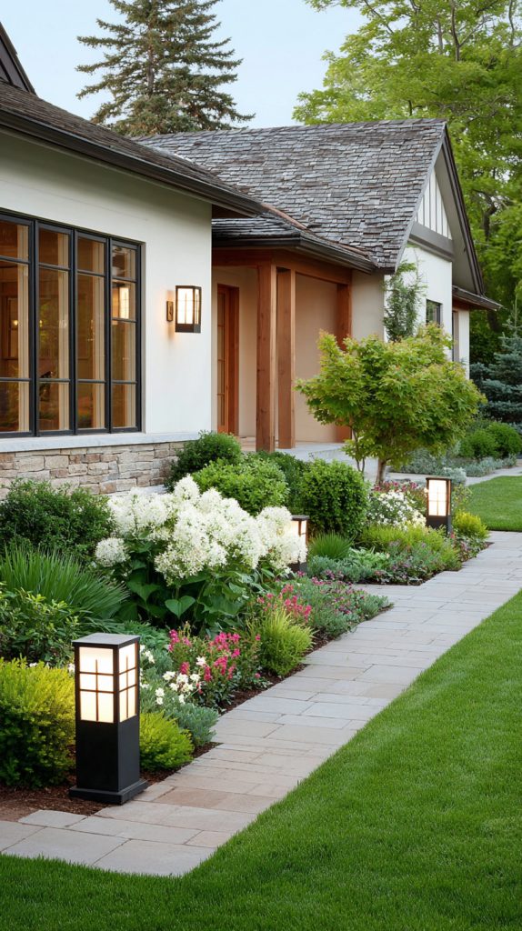 Adding lights along your pathways makes your front yard safer to walk at night. It also highlights your garden and gives your home a warm, welcoming look.