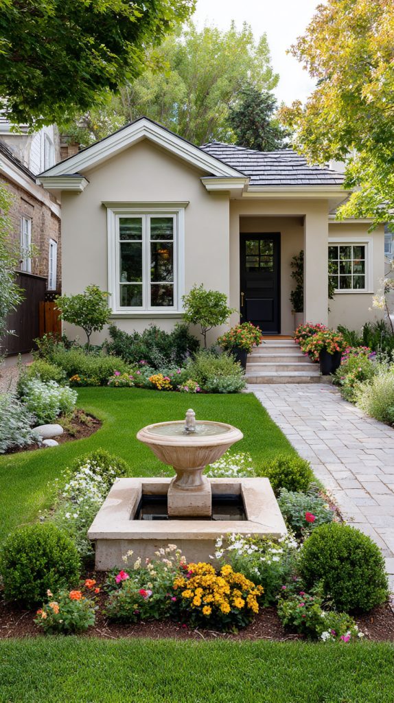 A small fountain adds a calm, relaxing sound to your front yard. It creates a peaceful spot for you to enjoy outside.