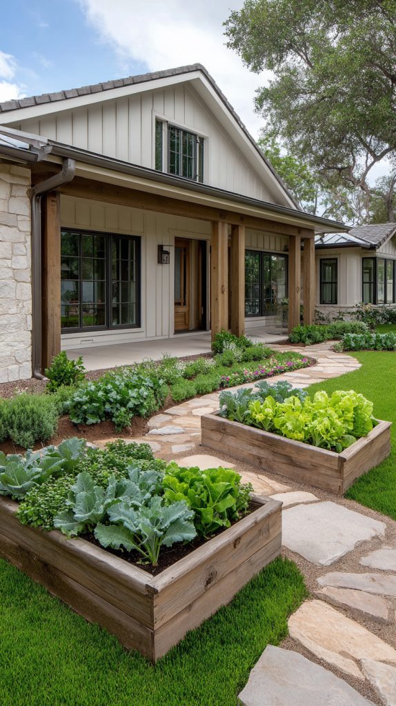 You can add charm and function to your front yard by building raised garden beds. They make growing vegetables or flowers easier because you control the soil quality better.