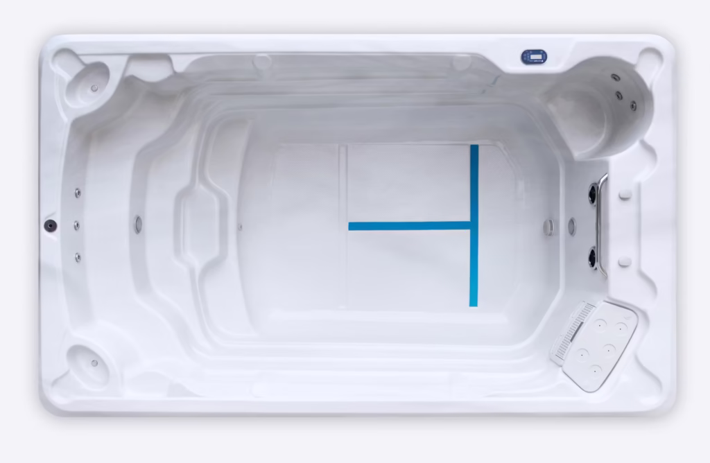 The remaining 5 feet creates a dedicated spa section with hydromassage seating for up to four people. Each zone has its own temperature controls, so you can keep the fitness area at a comfortable 82 degrees while the spa section stays at a toasty 104 degrees.