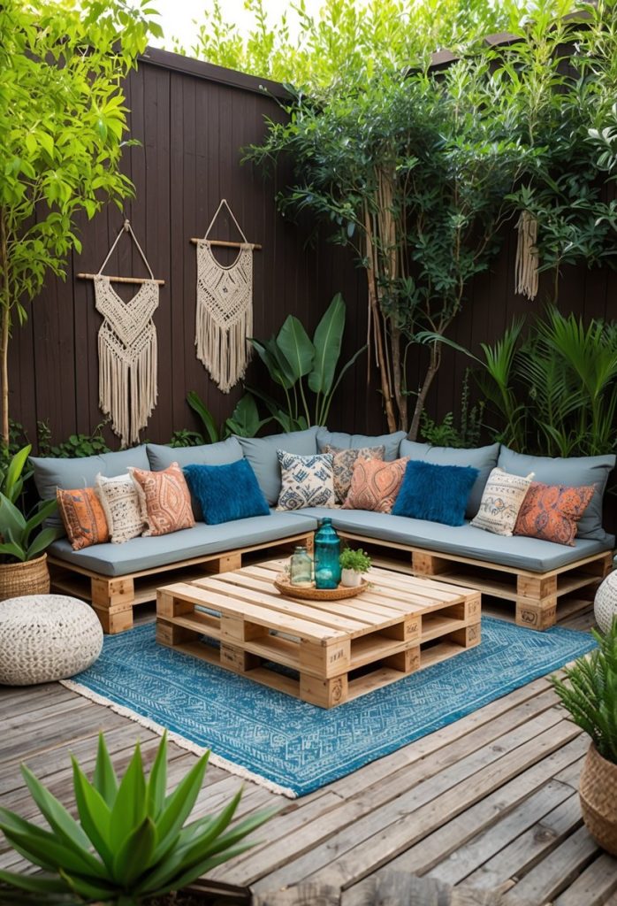 You can create a cozy spot in your backyard using low wooden pallet seating. Stack and arrange pallets to build simple benches or daybeds. Add some comfy cushions and throw pillows for an inviting boho touch. This look is easy to make and perfect for relaxing outside.