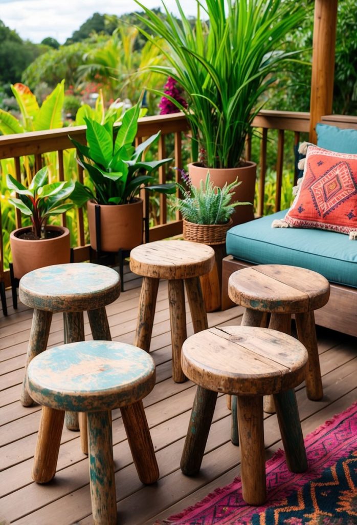 You can add character to your deck with distressed wooden stools. The worn finish gives your space a relaxed, lived-in feel.