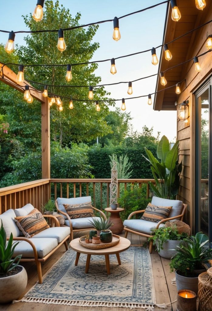 You can make your deck feel cozy by hanging string lights with vintage bulbs. These bulbs give off a soft, warm glow that works well for relaxed nights outside.