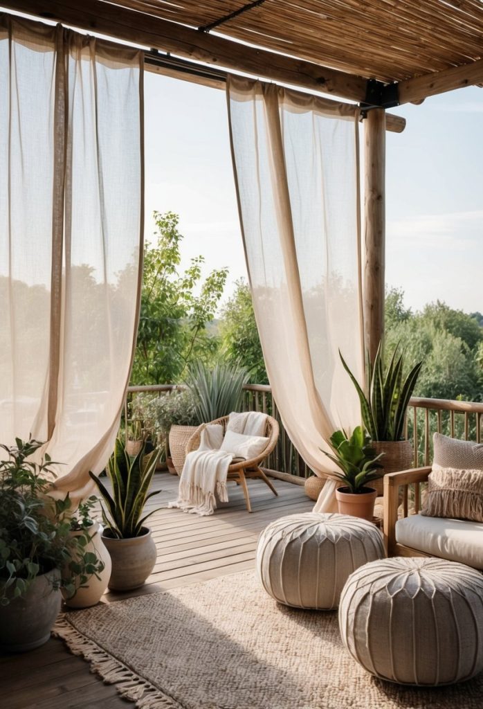 Add soft gauzy curtains to your deck for a cozy, laid-back feeling. These lightweight panels block some sun while still letting in a gentle breeze. You can tie them back or let them flow for a relaxed boho look.