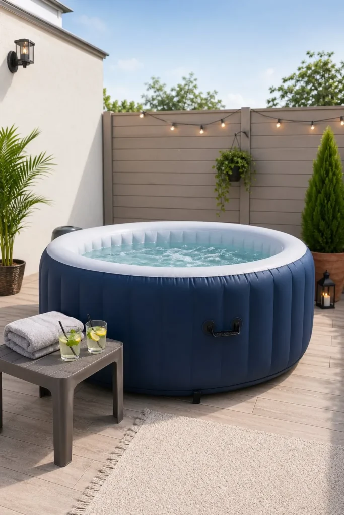 An inflatable spa is one of the easiest cheap budget hot tub patio ideas to copy. Set it on an existing patio, add a small side table, and use a thermal cover to hold heat and cut energy use. This is one of the best inflatable hot tub ideas backyard patio if you want a fast weekend setup.