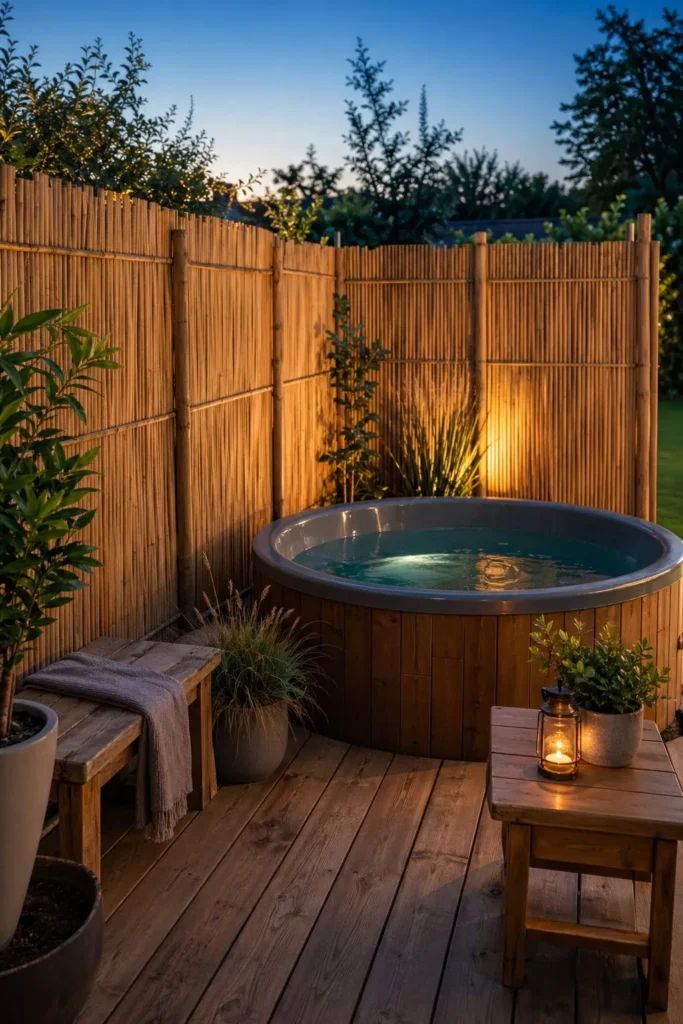 Reed fencing is light, cheap, and easy to attach to posts or an existing fence. It gives your spa corner more privacy and helps block wind at the same time. For quick hot tub privacy ideas diy cheap, this is a strong option.