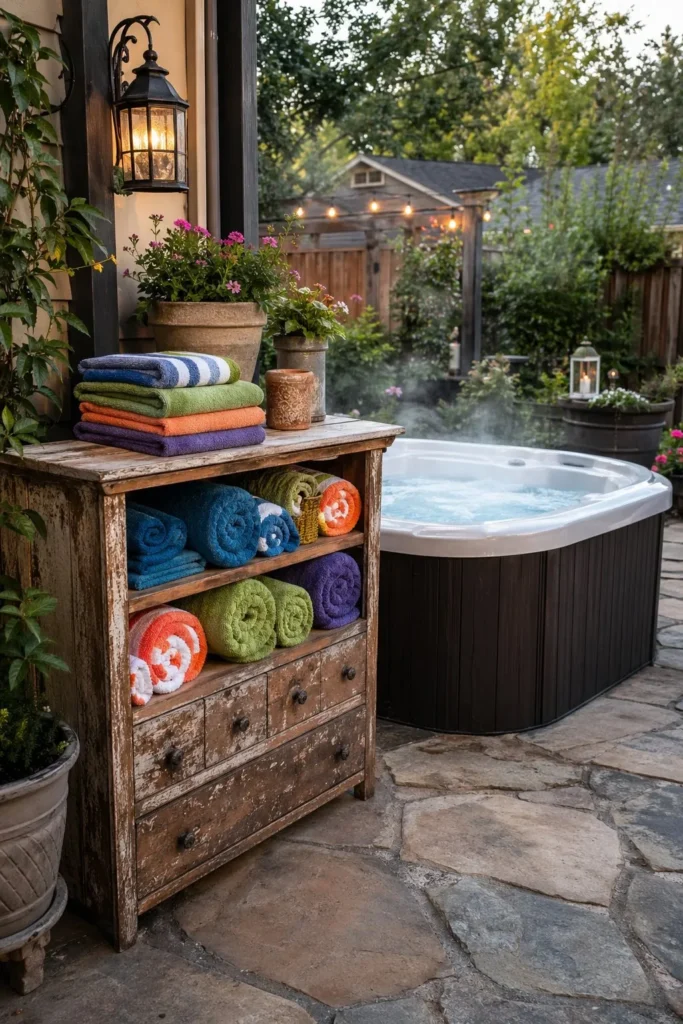 Use an old dresser, shelf, or bench as spa storage instead of buying new outdoor furniture. A coat of exterior paint can turn a thrift store find into a towel station with character. This keeps your patio organized without adding much cost.
