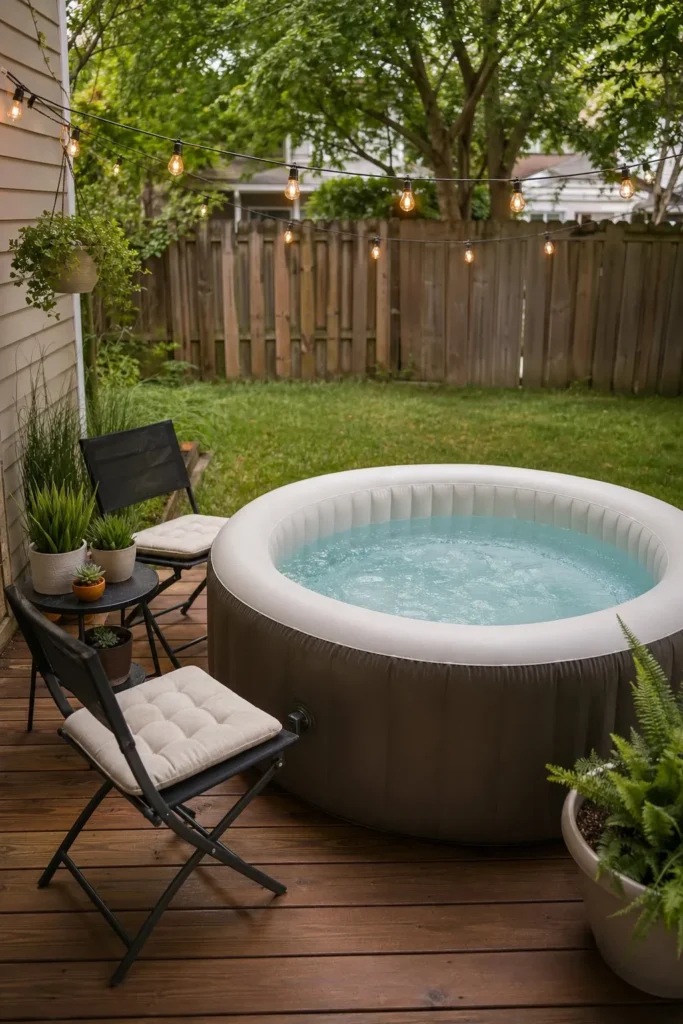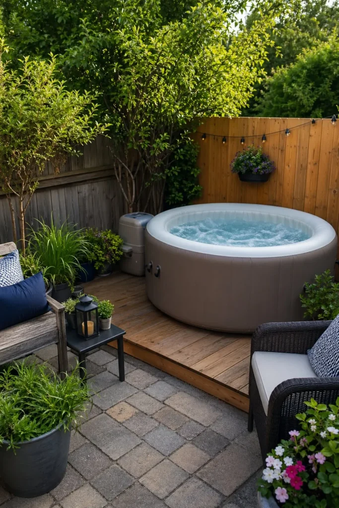 A small platform deck can make an inflatable spa feel more polished. Use pressure-treated lumber and keep the design low to the ground to save money. Among inflatable hot tub ideas backyard patio, this one adds style while staying doable for a weekend DIY.