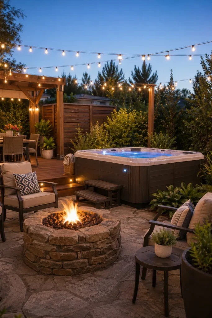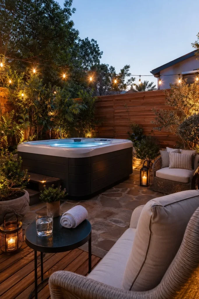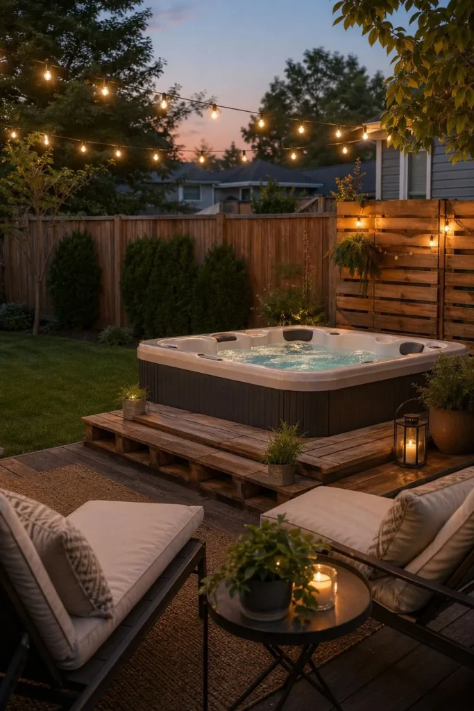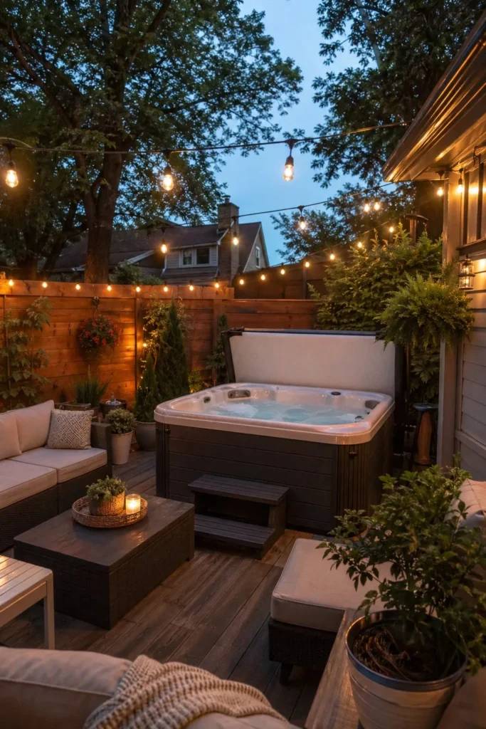 String lights add warmth without a big price tag. Hang solar or plug-in lights above your patio seating to make the spa area feel finished at night. This small upgrade gives your backyard hot tub setup more comfort for very little money.