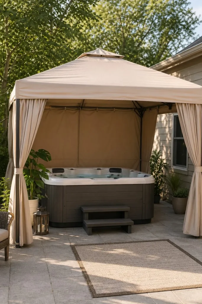 A pop-up canopy gives you shade, light rain cover, and visual privacy for less than a pergola. Pick a simple outdoor fabric style and anchor it well for safety. This is another easy win if you are searching for hot tub privacy ideas diy cheap.