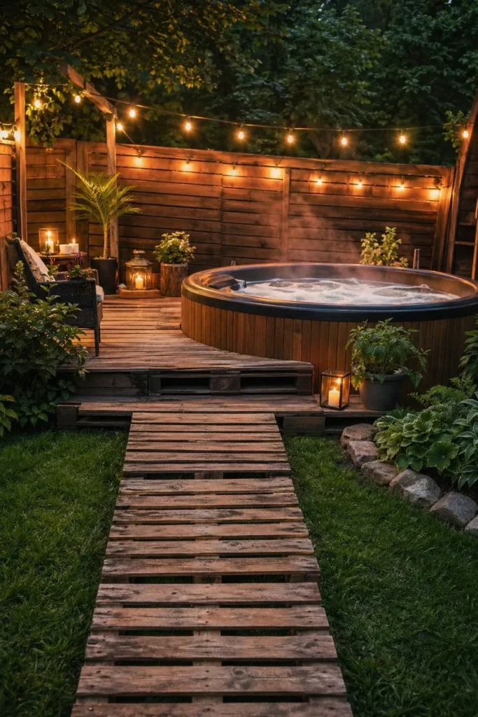 A pallet walkway helps keep mud and grass away from your spa. Break down pallets into boards, then lay them over gravel or stepping stones for a rustic path. It adds function and ties together other budget patio features.