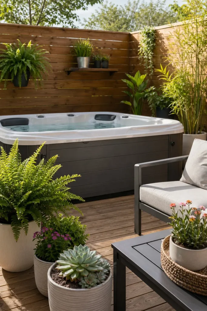 Potted plants are one of the cheapest ways to soften a patio. Use hardy choices like ornamental grasses, ferns, or small evergreens in simple containers. Grouping a few pots near the tub makes the space feel more planned and welcoming.
