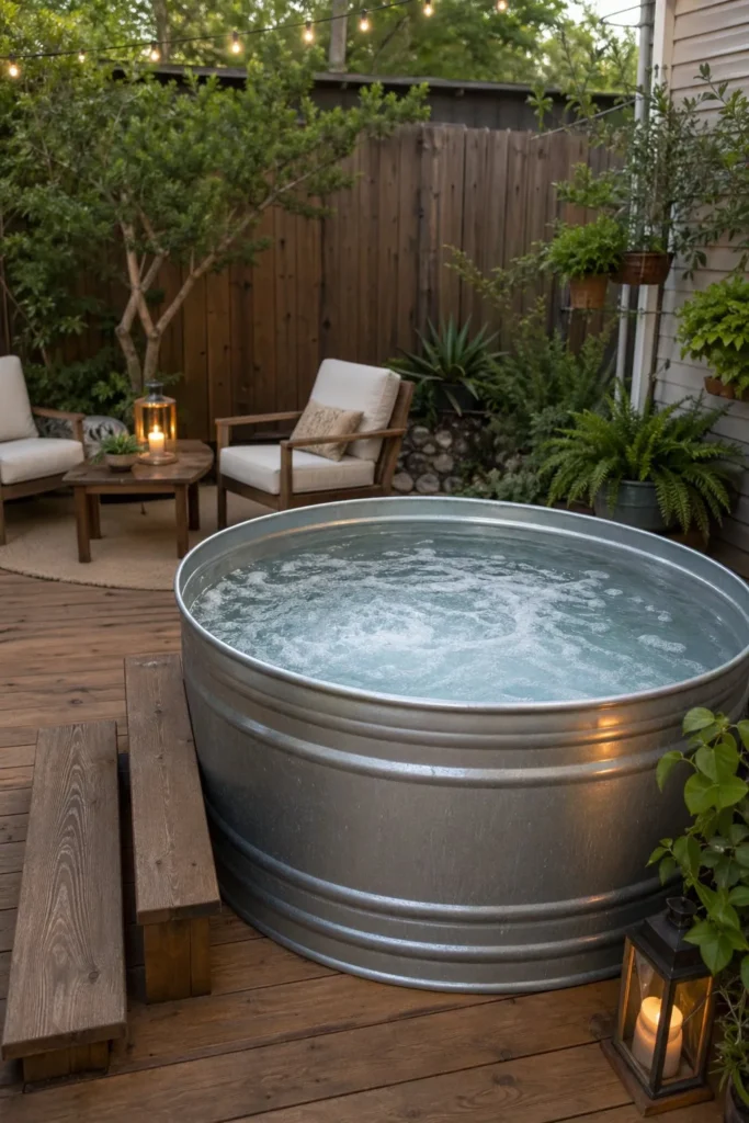 A galvanized stock tank gives you a rustic spa look for less than a traditional unit. Pair it with a basic heater setup, gravel flooring, and a few wood accents for a simple backyard soak zone. It works well if you want practical simple hot tub ideas backyard that still feel stylish.