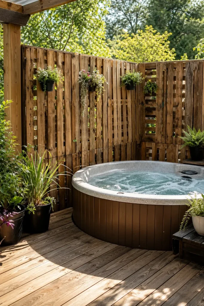 Free or low-cost pallets can become a privacy wall in one weekend. Sand them, stain them, and attach them to posts near the tub for a simple screen. This is one of the easiest hot tub privacy ideas diy cheap for renters and homeowners alike.