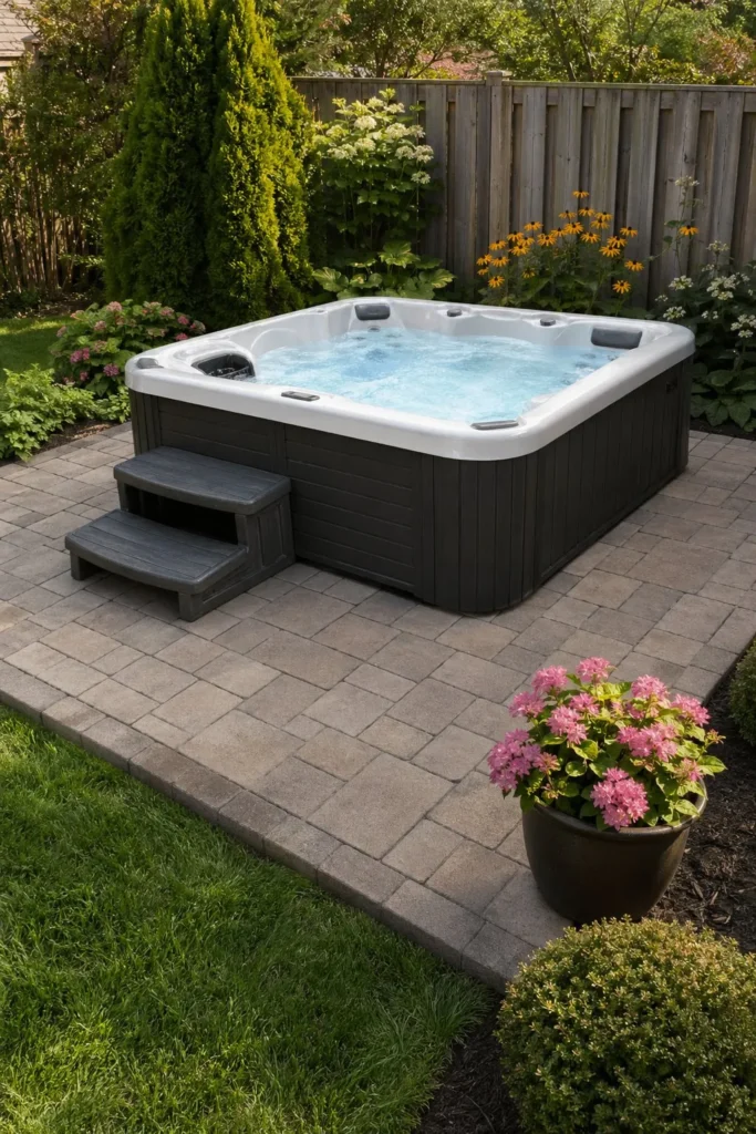 A tiny patio can still fit a compact 2- to 4-person spa. Keep the layout open with one bench, one storage bin, and a narrow path for safe entry. Small-space planning is often the key to smart cheap budget hot tub patio ideas.