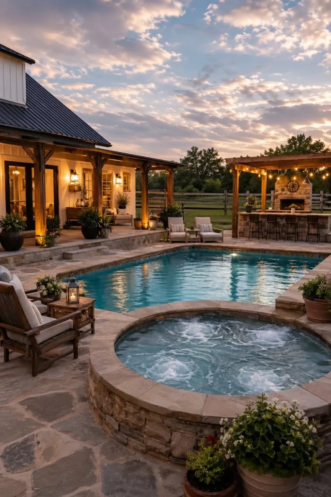 8. Farmhouse Style Cowboy Pool and Hot Tub Combo
