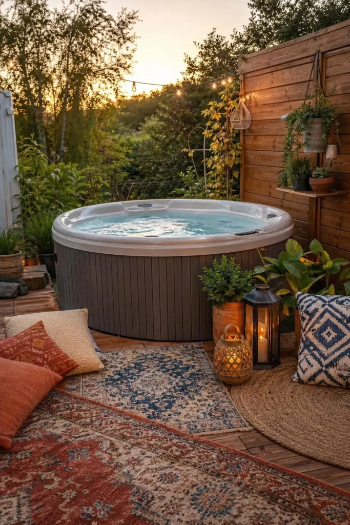 An outdoor rug and a few weather-friendly cushions can soften a plain spa corner fast. Look for discount textiles in earthy colors to create a relaxed boho vibe. This is one of those simple hot tub ideas backyard that changes the feel without changing the tub.