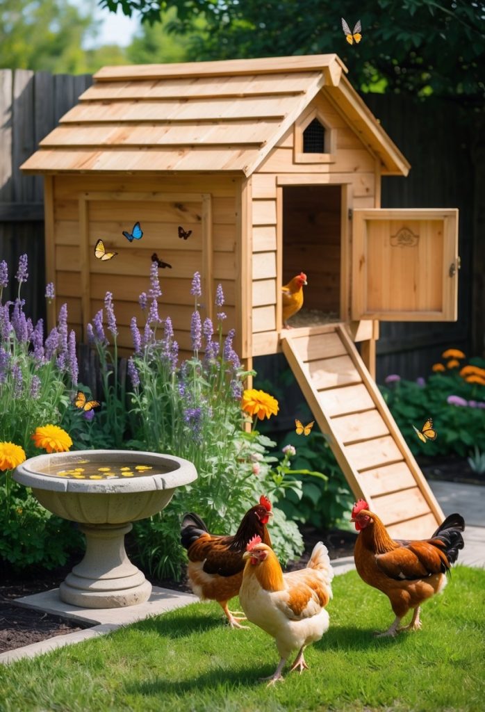 Adding a birdbath near your chicken coop can attract pollinators like bees and butterflies.