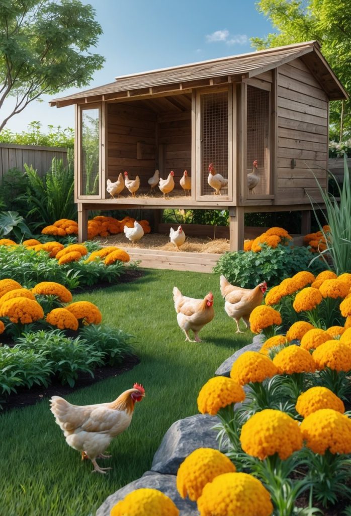 You can plant marigolds around your chicken coop to help keep pests away. Their strong smell repels insects like lice and mites. This makes your coop a more comfortable place for your chickens.