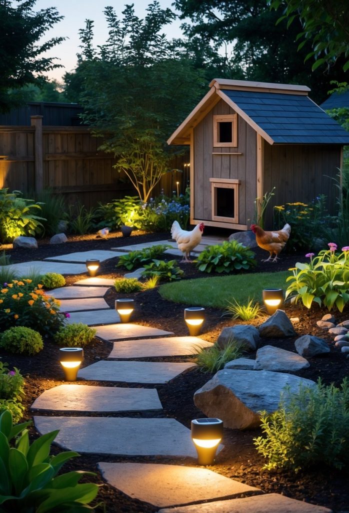 You can add solar-powered pathway lights around your chicken coop to keep the area safe at night. These lights do not need wiring, making them easy to set up.