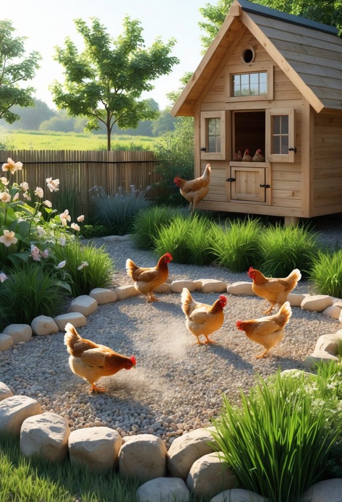 You can add a pebble or gravel spot in your chicken run for dust baths. Chickens love to scratch and roll there, which helps keep their feathers clean and free of pests. Make sure the area stays dry and loose for the best results.
