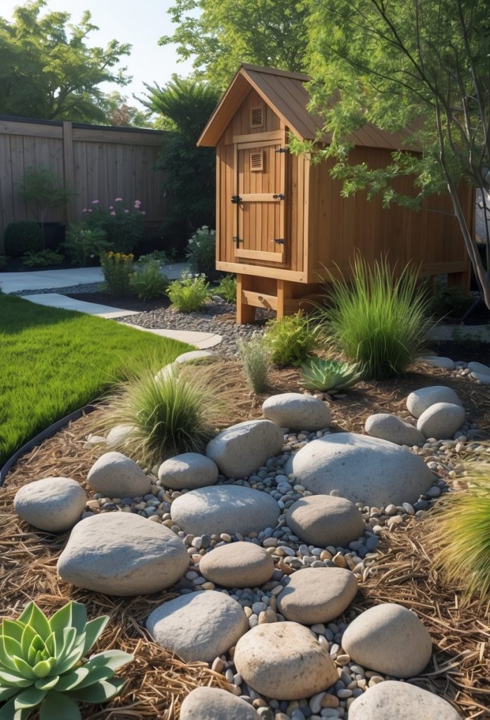 You can add a small rock garden near your chicken coop to help with drainage. It keeps water from pooling and makes the area less muddy.