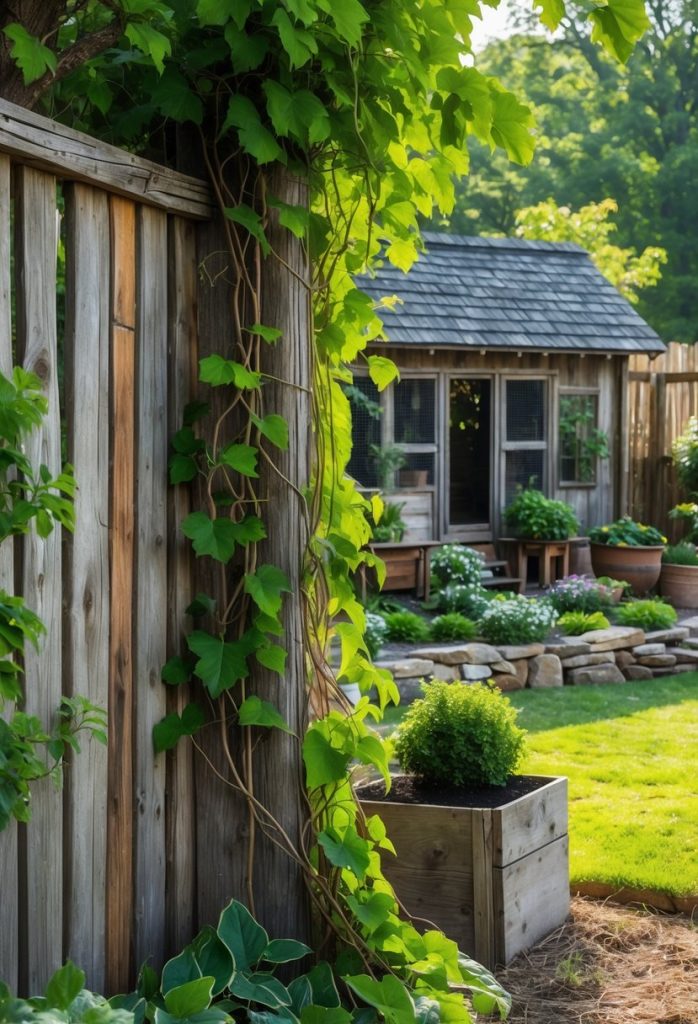 Add climbing vines like peas or flowering plants to grow up the fence. This creates natural shade and saves space in your garden.