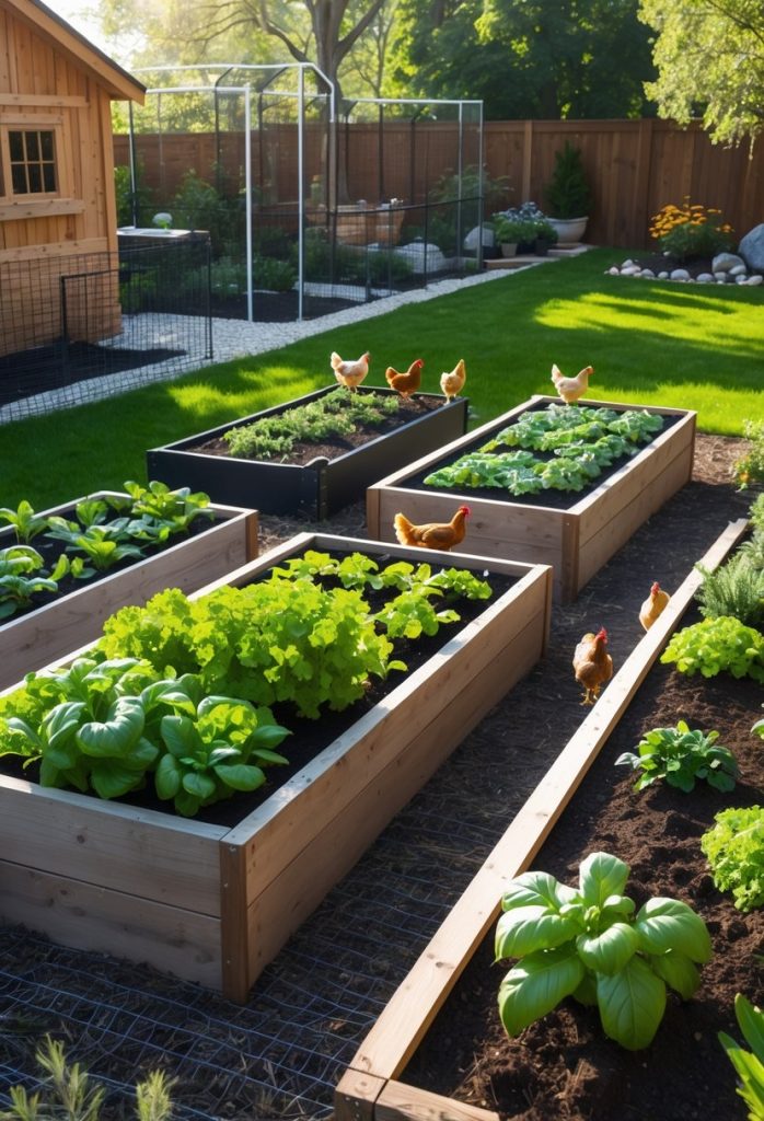 You can place raised garden beds next to your chicken run to save space. This setup lets you grow plants while keeping chickens safe and happy nearby. Raised beds also help with soil drainage and make gardening easier for you.